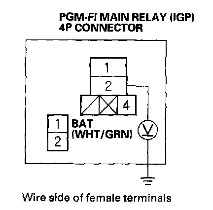 34. Measure voltage between PGM-FI main relay (IGP) 4P connector terminal No. 2 and body ground.
