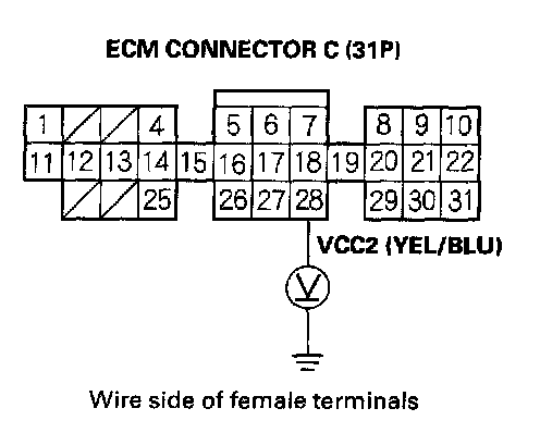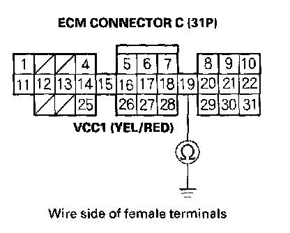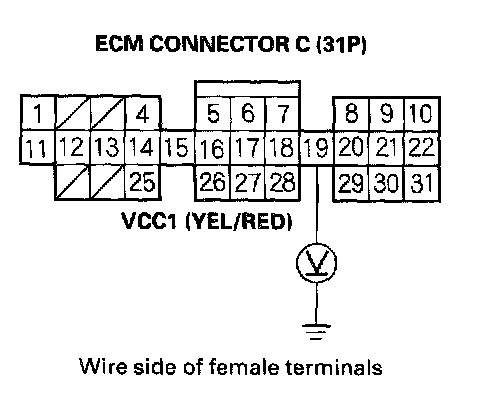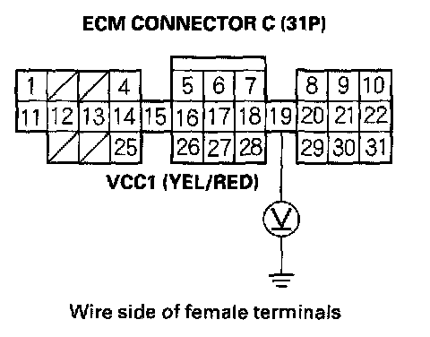 38. Measure voltage between body ground and ECM connector terminal C19.