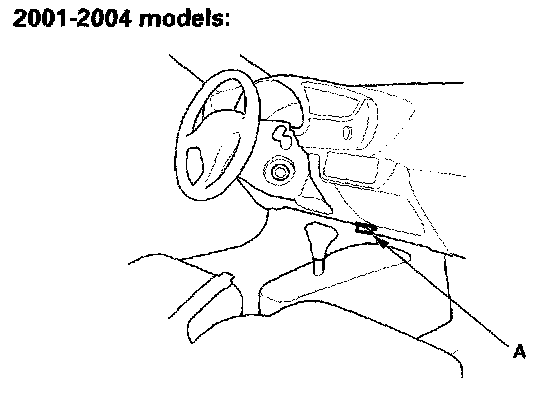2. If the MIL stays on, connect the HDS or scan tool to the data link connector (DLC) (A) located under the driver's (passenger's) side of the dashboard.