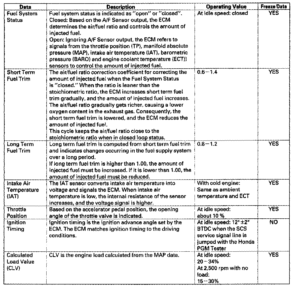 ECM DataYou can retrieve data from the ECM by connecting a scan tool or the HDS to the 16P data link connector (DLC). The items listed in the table shown conform to SAE recommended practice. The HDS also reads data beyond that recommended by SAE. Understanding this data may help you find the causes of intermittent problems.