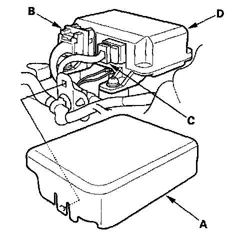 4. Remove the cover (A), then disconnect the floor wire harness 18P (B) and 8P (C) connectors from the SRS unit (D).