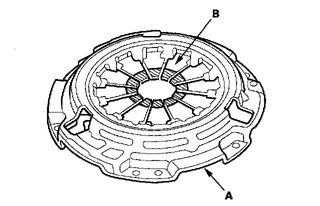 5. Inspect the fingers of the diaphragm spring (B) for wear at the release bearing contact area.