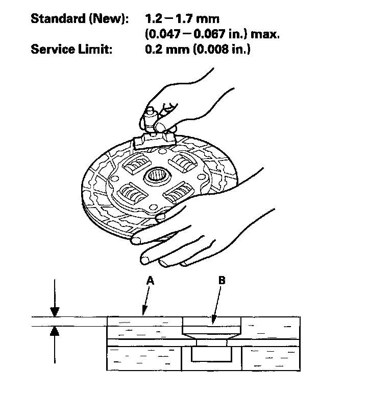 9. Measure the clutch disc thickness. If the thickness is less than the service limit, replace the clutch disc.