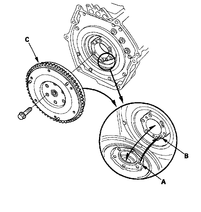7. Align the hole (A) in the flywheel with the crankshaft dowel pin (B), and install the flywheel (C). Install the mounting bolts finger-tight.