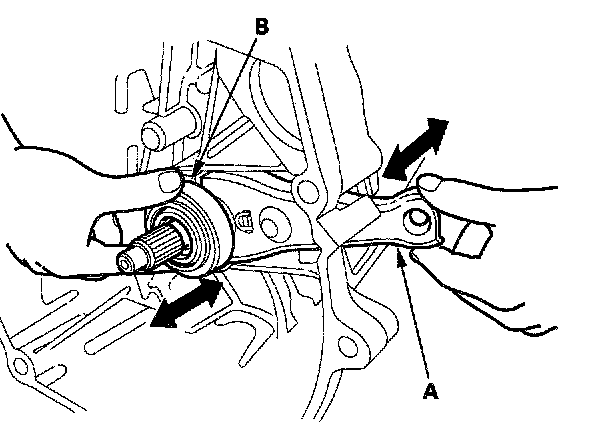 8. Move the release fork (A) right and left to make sure that it fits properly against the release bearing (B) and that the release bearing slides smoothly.