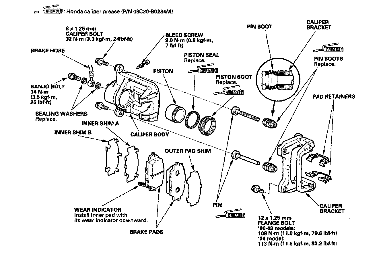 ^ Make sure no dirt or other foreign matter gets in the brake fluid. Make sure no grease or oil gets on the brake discs or pads. When reusing pads, always reinstall them in their original positions to prevent loss of braking efficiency.