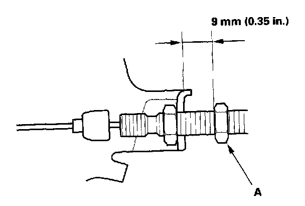 5. Turn the adjusting nut (A) until it is 9 mm (0.35 in.) away from the actuator cable bracket when the throttle linkage starts open.