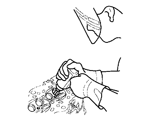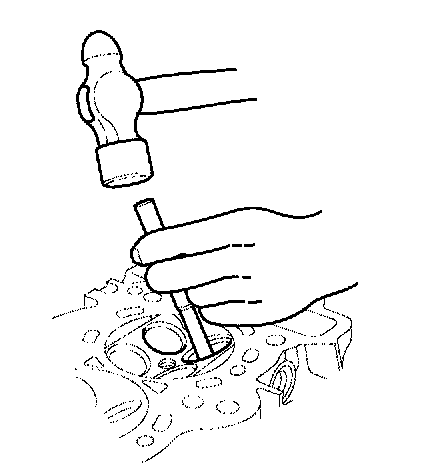4. Working from the camshaft side, use the driver and an air hammer to drive the guide about 2 mm (0.1 inch) towards the combustion chamber. This will knock off some of the carbon and make removal easier. Hold the air hammer directly in line with the valve guide to prevent damaging the driver.