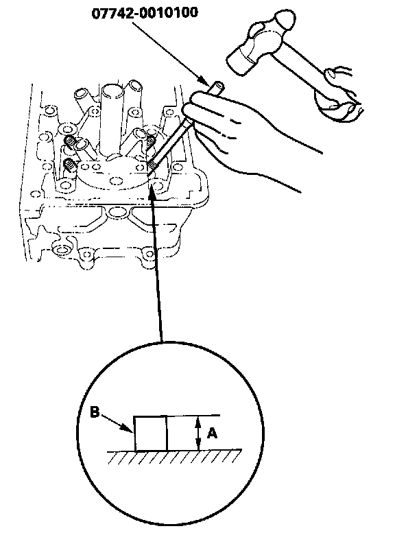 1. As illustrated, use a commercially available air-impact valve guide driver (A) modified to fit the diameter of the valve guides. In most cases, the same procedure can be done using the special tool and a conventional hammer.