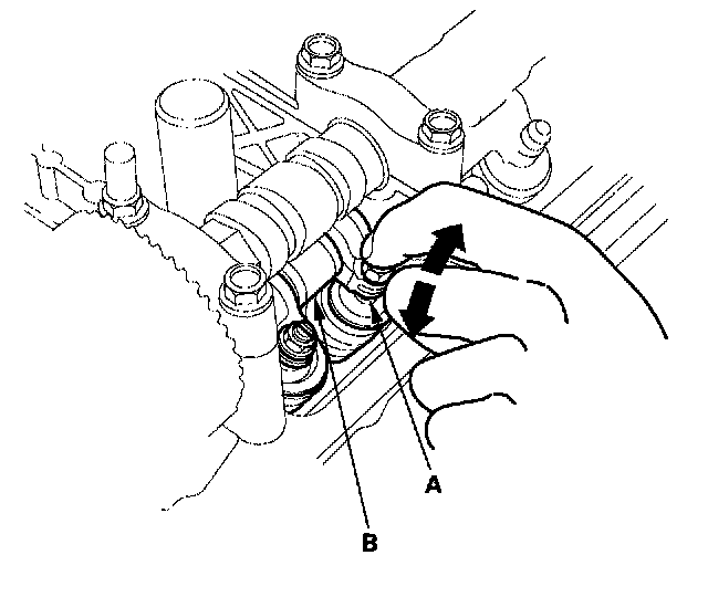 3. Move the secondary rocker arm (A) for No. 1 cylinder. The secondary rocker arm should move independently of the mid rocker arm (B).