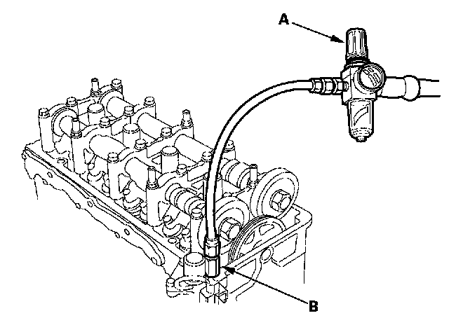 6. Connect an air pressure regulator with a 0 - 100 psi gauge (A) to the inspection hole (B).