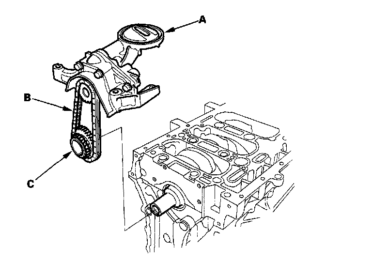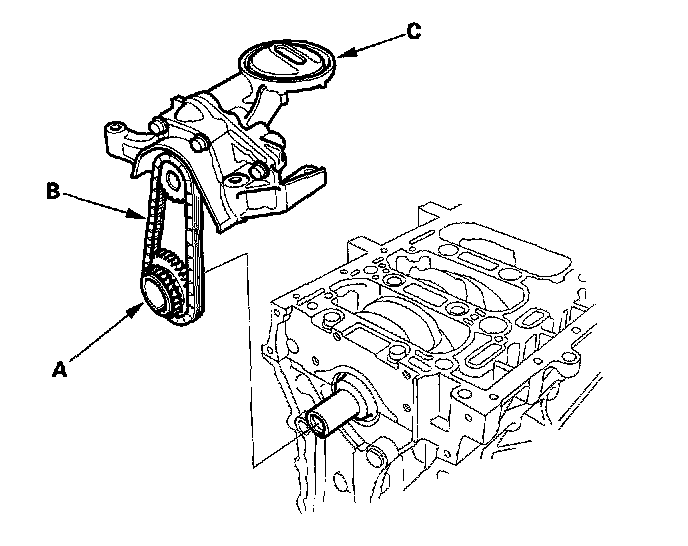 12. Install the crankshaft sprocket (A), oil pump chain (B) and oil pump (C).