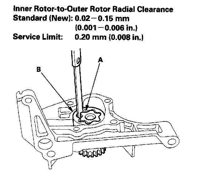 7. Check the inner-to-outer rotor radial clearance between the inner rotor (A) and outer rotor (B). If the inner-to-outer rotor radial clearance exceeds the service limit, replace the outer rotor and oil pump housing.