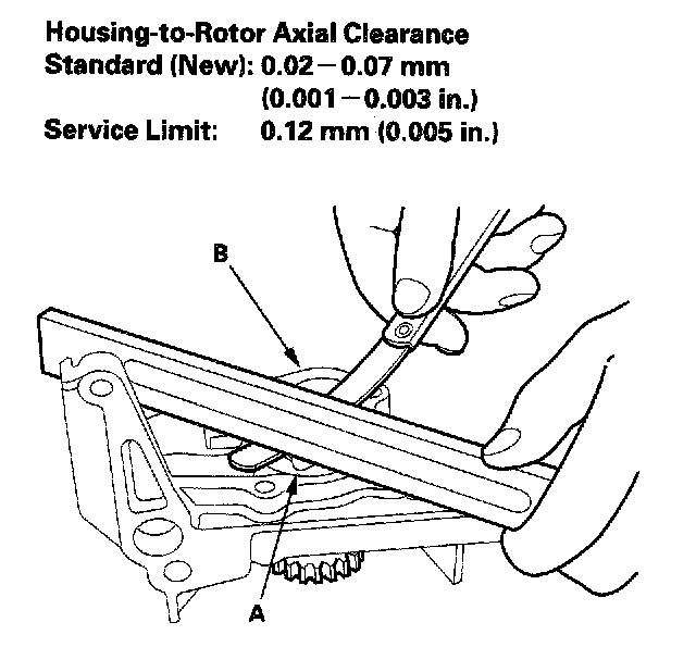 8. Check the housing-to-rotor axial clearance between the rotor (A) and pump housing (B). If the housing-to-rotor axial clearance exceeds the service limit, replace the outer rotor and oil pump housing.