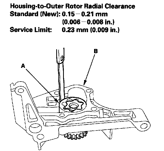 9. Check the housing-to-outer rotor radial clearance between the outer rotor (A) and pump housing (B). If the housing-to-outer rotor radial clearance exceeds the service limit, replace the outer rotor and oil pump housing.