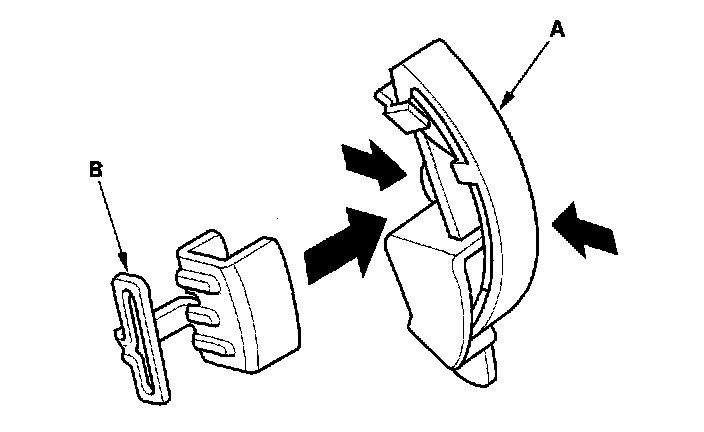11. Squeeze the new oil pump chain tensioner (A), then install the set clip (B) on it as shown.