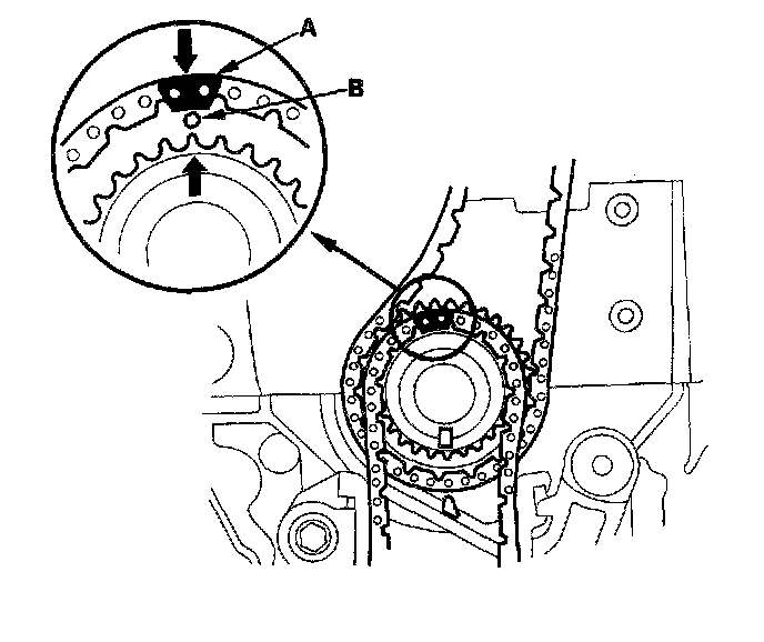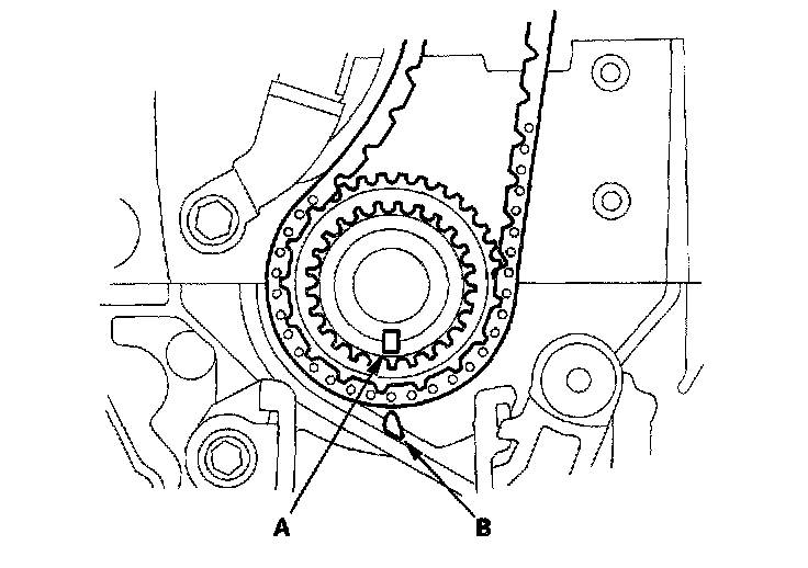 15. Set the crankshaft sprocket so that the No. 1 piston is at Top Dead Center (TDC). Align the key (A) on the sprocket and crankshaft with the pointer (B) on the cylinder block.