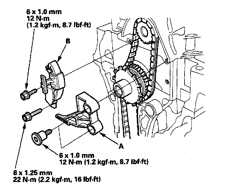 17. Install the oil pump chain guide (A) and oil pump chain tensioner (B).