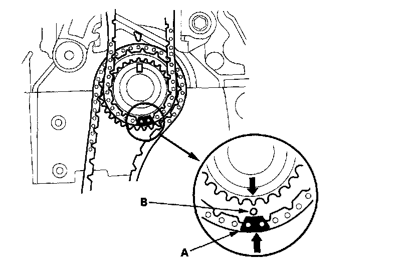 1. Set the crankshaft sprocket so that the No.1 Piston is at Top Dead Center (TDC). Align the key (A) on the sprocket and crankshaft with the pointer (B) on the cylinder block.