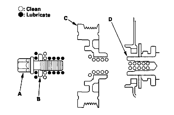 12. Clean the bolt (A), washer (B), pulley (C) and crankshaft (D). Lubricate as shown.