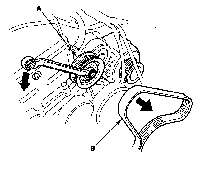 8. Move the auto-tensioner (A) to remove tension from the alternator-compressor belt (B), then remove the alternator-compressor belt.