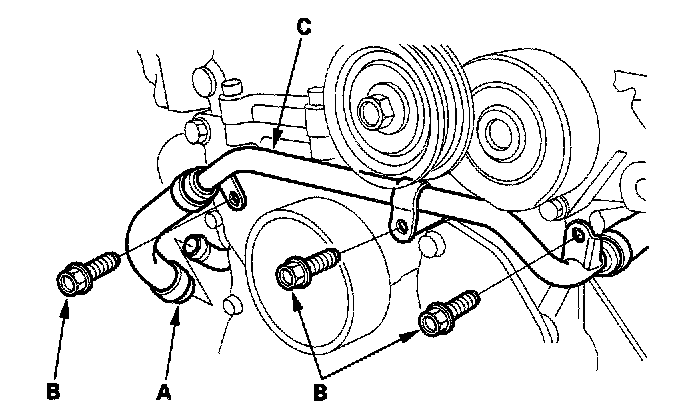 9. Remove the water bypass hose (A), then remove the three bolts (B) securing the water bypass tube (C).