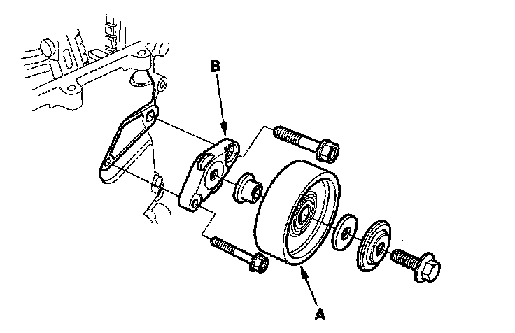 13. Remove the idler pulley (A), then remove the idler pulley base (B).
