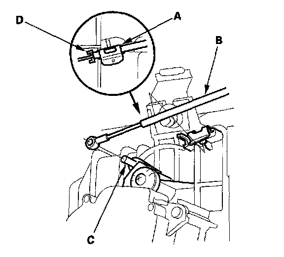 4. Attach the heater valve cable (B) to the air mix control linkage (C) as shown. Hold the end of the heater valve cable housing against the stop (D), then snap the heater valve cable housing into the cable clamp (A).