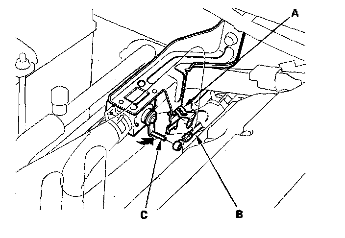 Heater Valve Cable Adjustment1. From under the hood, open the cable clamp (A), then disconnect the heater valve cable (B) from the heater valve arm (C).