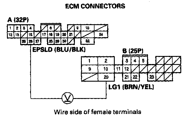 5. Measure voltage between ECM connector terminals A26 and B20.