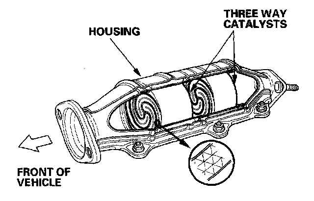 The TWC converts hydrocarbons (HO, carbon monoxide (CO), and oxides of nitrogen (NOx) in the exhaust gas to carbon dioxide (CO2), nitrogen (N2), and water vapor.