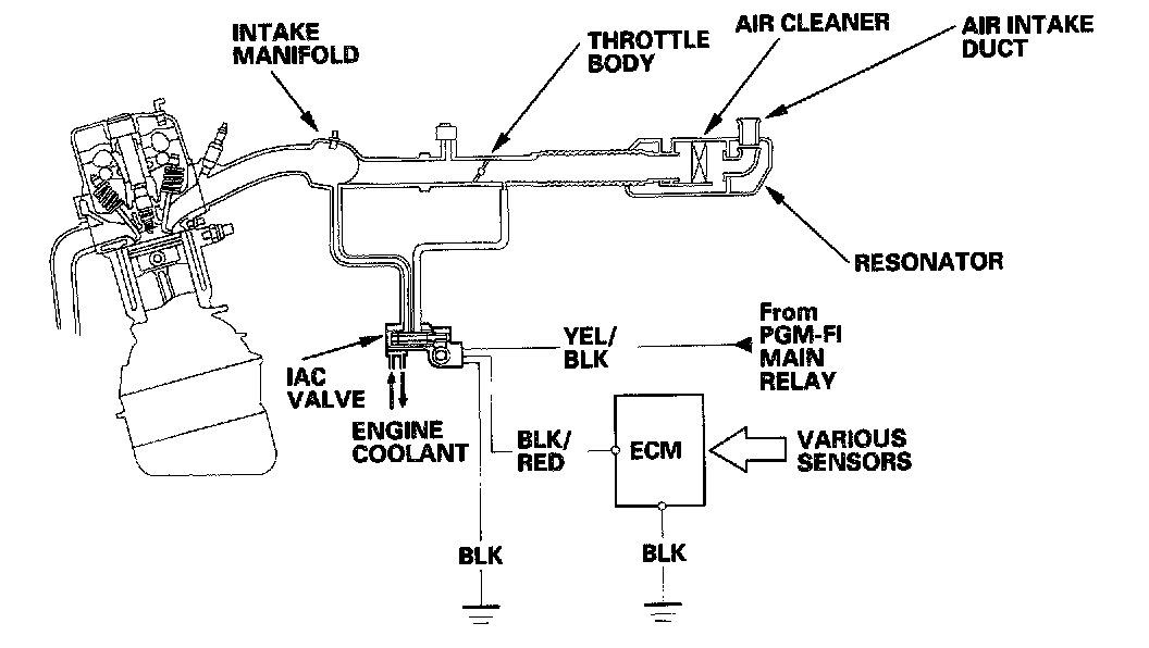When the engine is cold, the A/C compressor is on, the transmission is in gear, the brake pedal is pressed, the P/S load is high, or the alternator is charging, the ECM controls current to the IAC valve to maintain the correct idle speed.