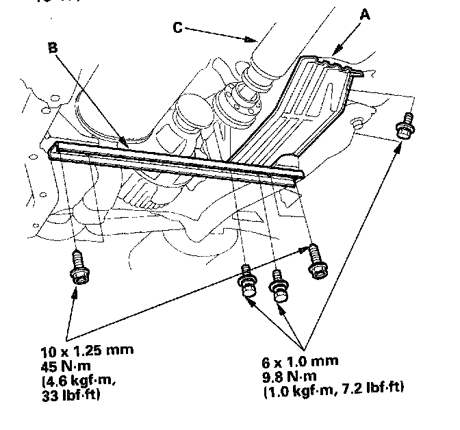16. Remove the canister cover (A), rear suspension stiffener (B), and the propeller shaft (C).