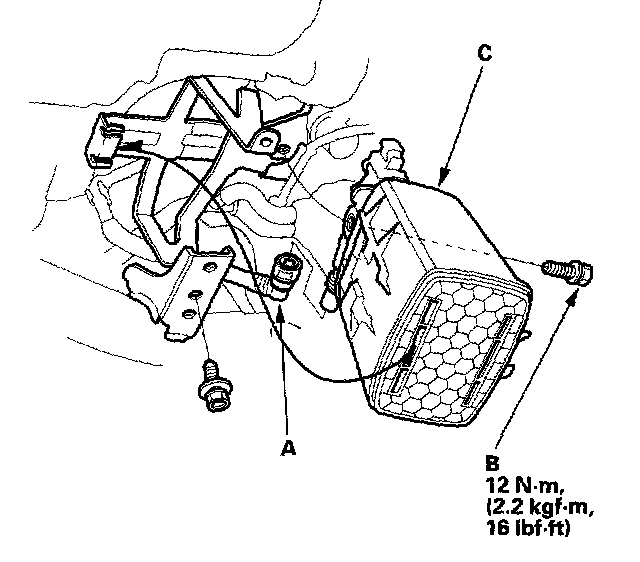 19. Disconnect the fuel tank vapor vent tube (A), then remove the bolt (B) and the EVAP canister (C).
