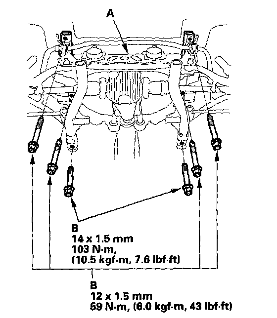 21. Place a jack or other support under the rear suspension subframe (A). Remove the mounting bolts (B) and the rear suspension subframe (A).