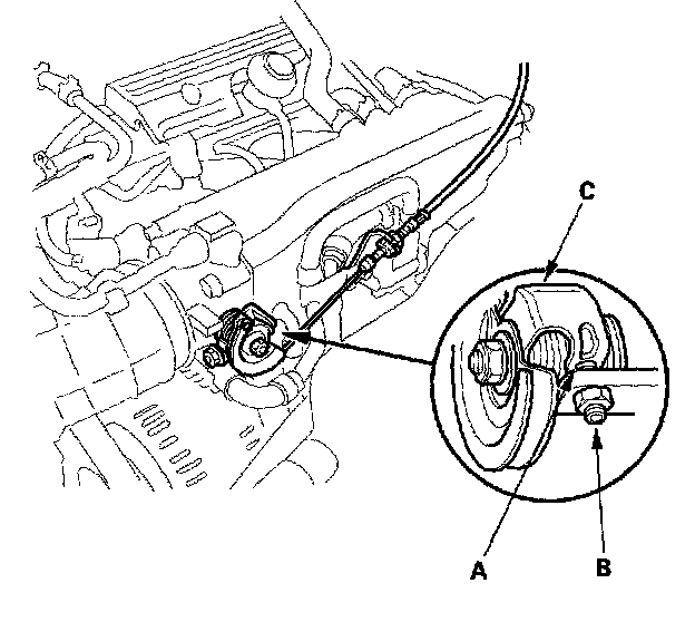 3. Check for clearance (A) between the throttle stop screw (B) and the throttle lever (C) at the fully closed position. If there is any clearance, replace the throttle body. Do not adjust the throttle stop screw.
