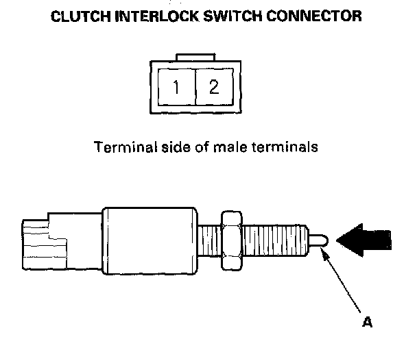 2. Check the clutch interlock switch connector terminals for continuity. There should be no continuity between the terminals with the button (A) released, and there should be continuity with the button pressed.