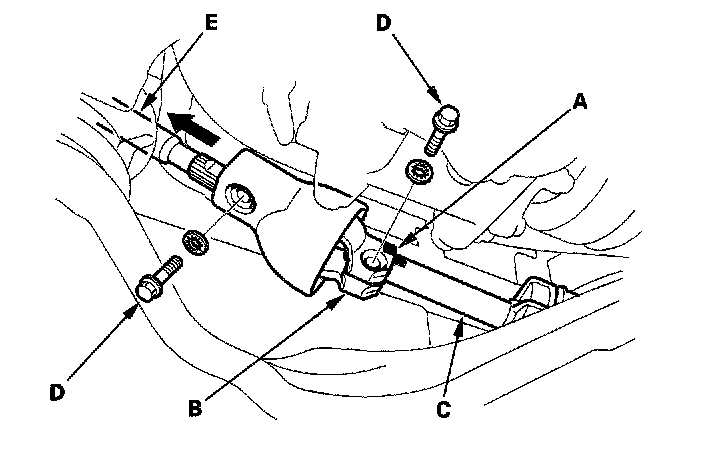 4. Slip the joint (A) of the column shaft onto the steering shaft (B), then loosely install the joint bolt (C) (line up the bolt hole (D) with the flat portion (E) of the shaft). Pull the steering shaft toward the column.