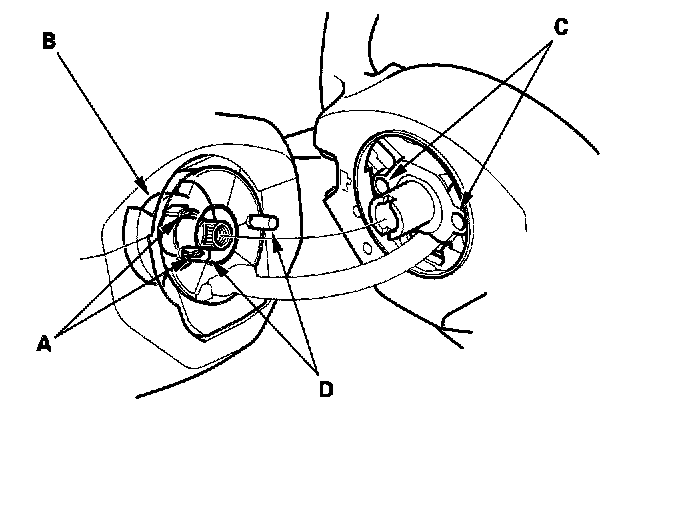 2. Position the two tabs (A) of the turn signal canceling sleeve (B), and install the steering wheel on to the steering column shaft, making sure the steering wheel hub (C) engages the pins (D) of the cable reel and tabs of the canceling sleeve. Do not tap on the steering wheel or steering column shaft when installing the steering wheel.
