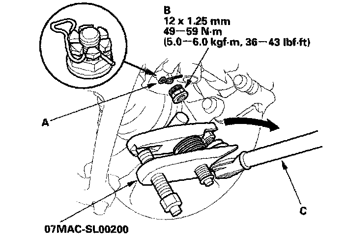 NOTE: Turn the control arm (C) outward to install the ball joint remover.
