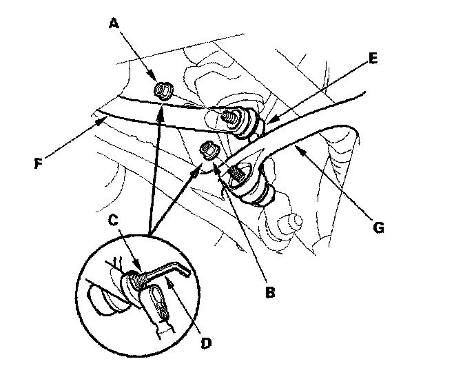 2. Remove the self-locking nut (A) and flange nut (B) while holding the respective joint pins (C) with a hex wrench (D), and disconnect the stabilizer link (E) from the stabilizer bar (F) and the lower arm (G).