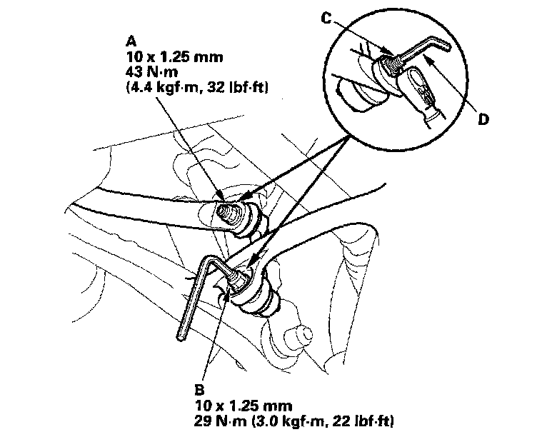 6. Tighten the self-locking nut (A) and flange nut (B) to the specified torque values while holding the respective joint pins (C) with a hex wrench (D).