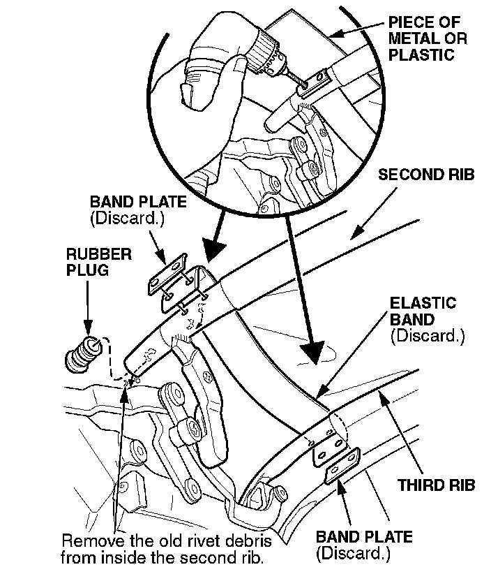 7. Remove the rubber plugs from the ends of the second rib, and shake the rib to remove the old pop rivet. Reinstall the rubber plugs.
