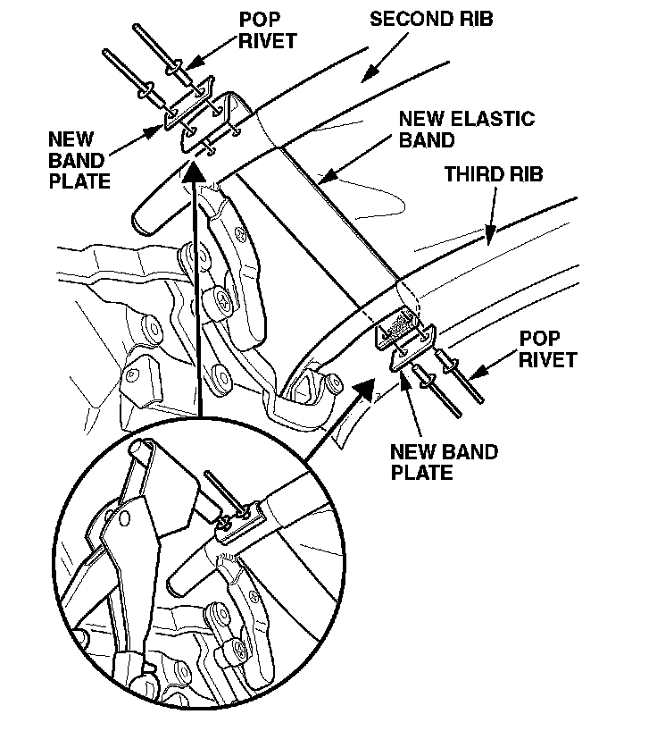 4. Using a cut off wheel or a 90-degree drill with a bit no larger in diameter than the rivet (3.6 mm), cut the heads off of the eight pop rivets that secure the two elastic bands to the second and third ribs of the convertible top.