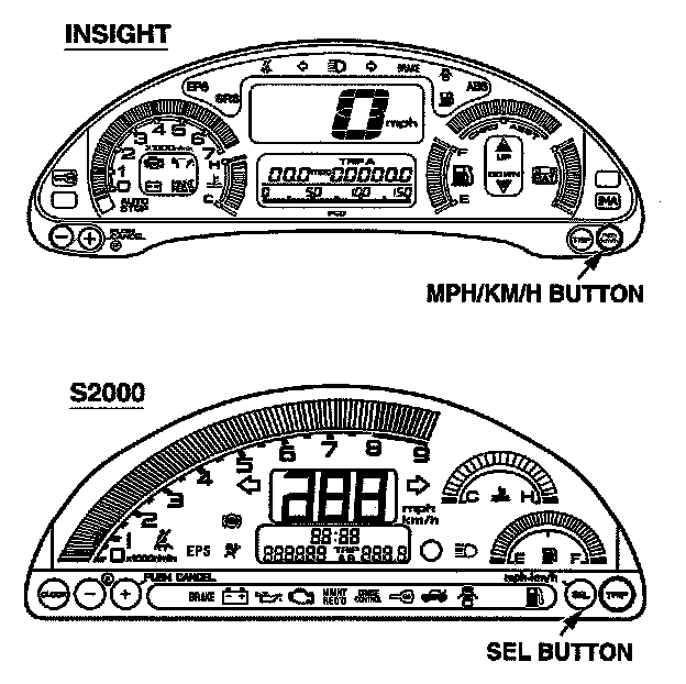 The mph/km/h button on the Insight gauge assembly (it's the SEL button for S2000s) switches the speedometer reading between miles per hour and kilometers per hour. It also switches the odometer and the trip meters to read in miles or kilometers.