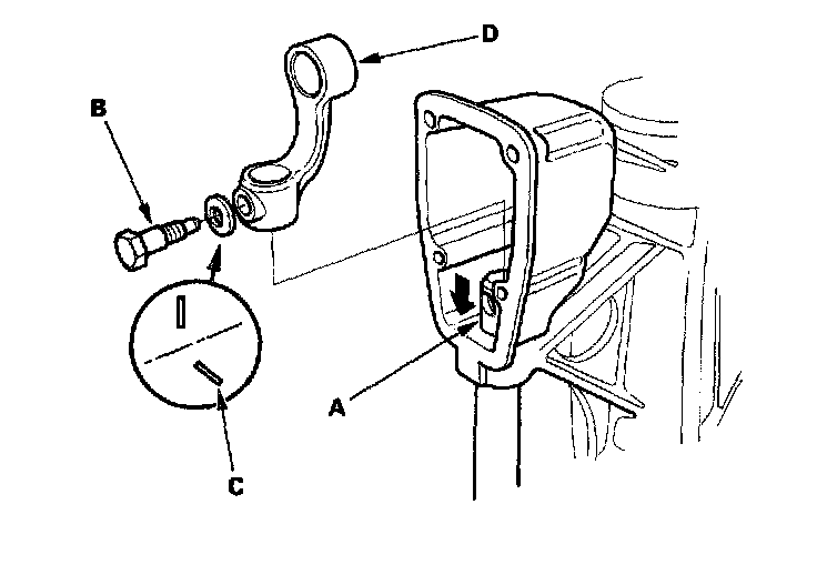 2. Lower the shift rod (A), then remove the 8 mm special bolt (B), the spring washer (C), and the shift arm B (D).