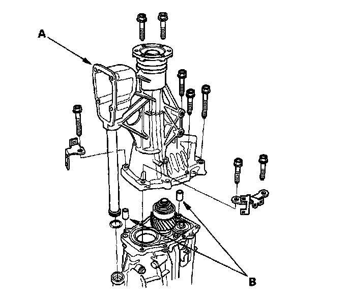4. Remove the rear cover (A) and the 14 x 20 dowel pins (B).
