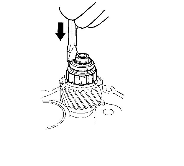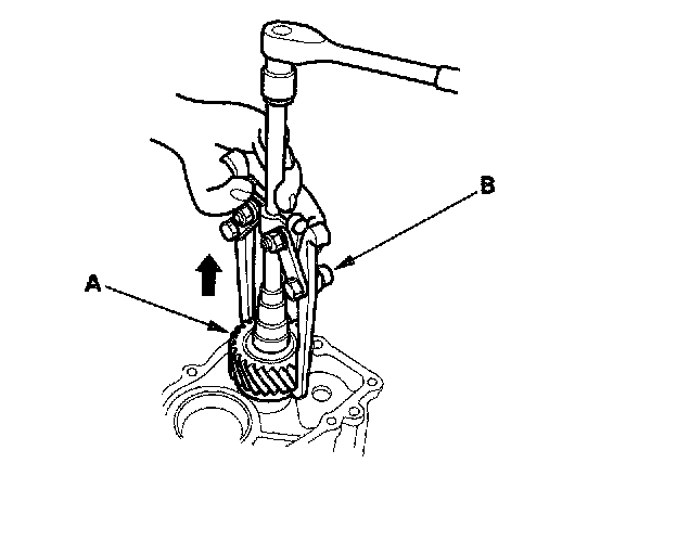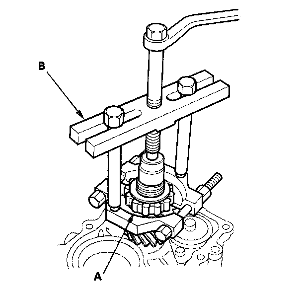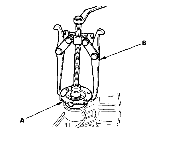 6. Remove the secondary drive gear (A) using a commercially available bearing puller (B) as shown.