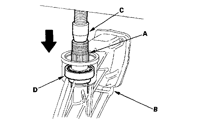8. Remove the 27 mm locknut (A), the spring washer (B), the back-up ring (C), and the O-ring (D).