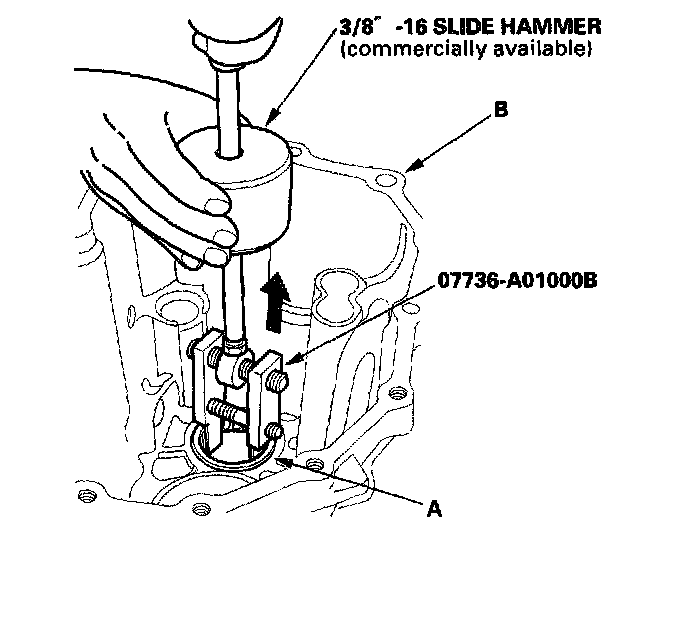 12. Remove the bearing outer race (A) using the special tool as shown, then remove the shim (B) and the oil guide plate S.